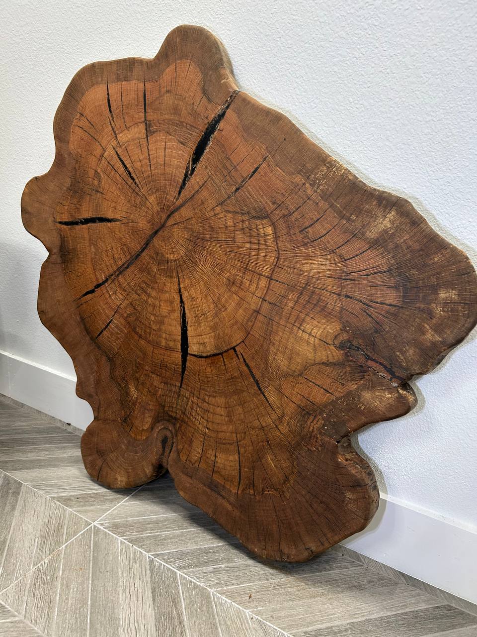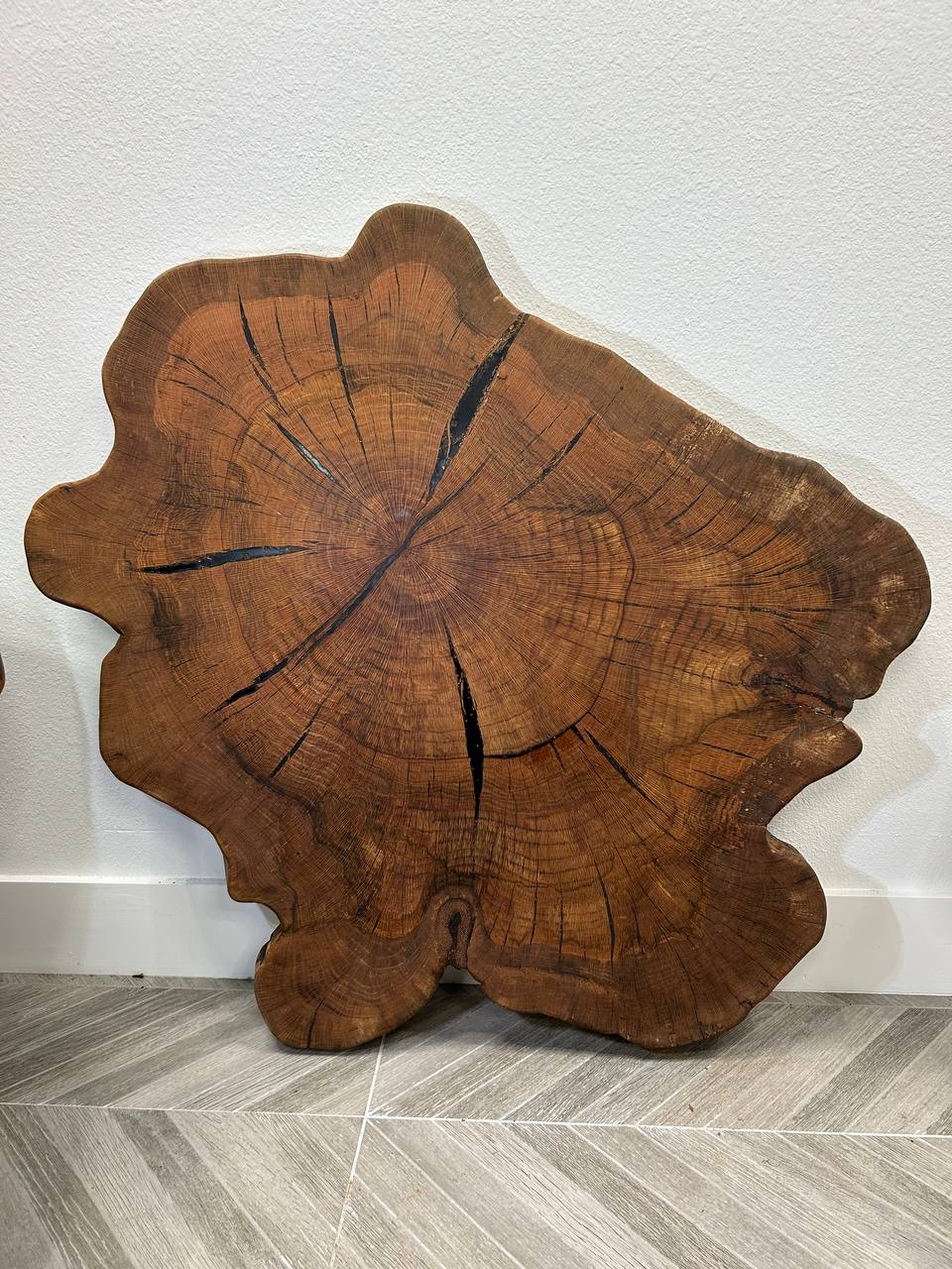 With dimensions of 42 × 37 × 2.5 inches, this slab provides a large, balanced surface suitable for a coffee table or statement piece. The cross-cut structure highlights concentric growth rings and natural stress lines, creating a dramatic visual pattern. The organic edge and natural checking add authenticity and emphasize that this is a true one-of-a-kind slab.