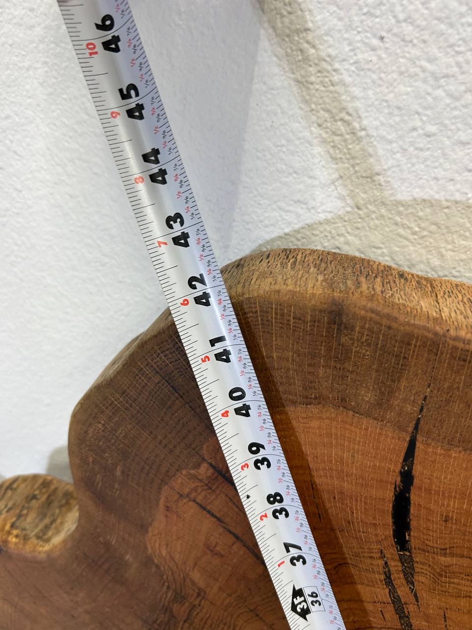 This round wood slab is most likely hickory — based on density, pronounced growth ring contrast, and characteristic radial cracking. Hickory is one of the hardest domestic hardwoods in the U.S., known for its strength, durability, and high impact resistance, making it ideal for furniture that must withstand daily use.
