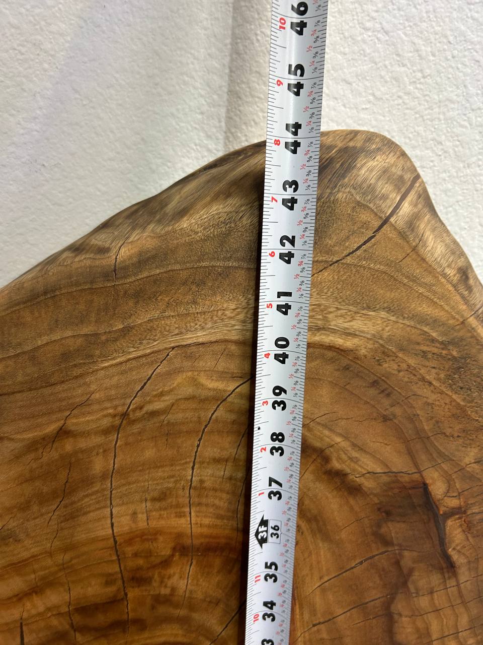 Sycamore round wood slab RWS002, 44 × 34.5 × 2 inches. Natural cross-cut slab with unique grain, ideal for coffee table.