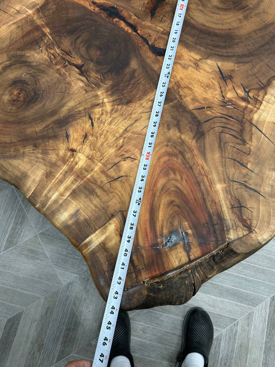 With dimensions of 44 × 32 × 2.5 inches, this slab offers a broad, furniture-ready surface with substantial visual weight. The 2.5-inch thickness gives it a more premium, solid look than thinner rounds and makes it especially suitable for custom coffee table projects where the slab itself is the centerpiece.