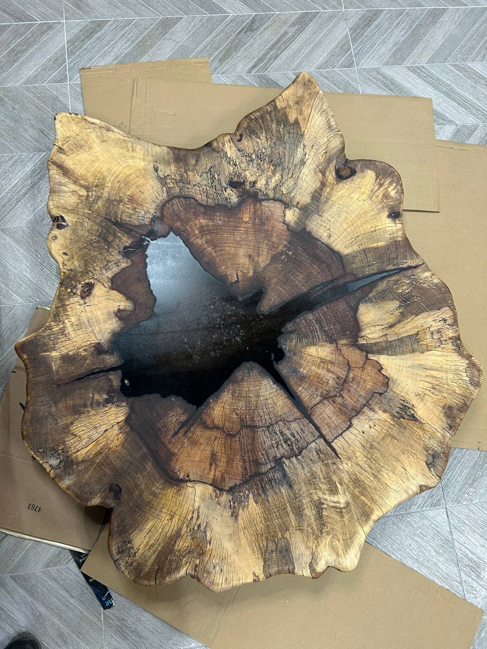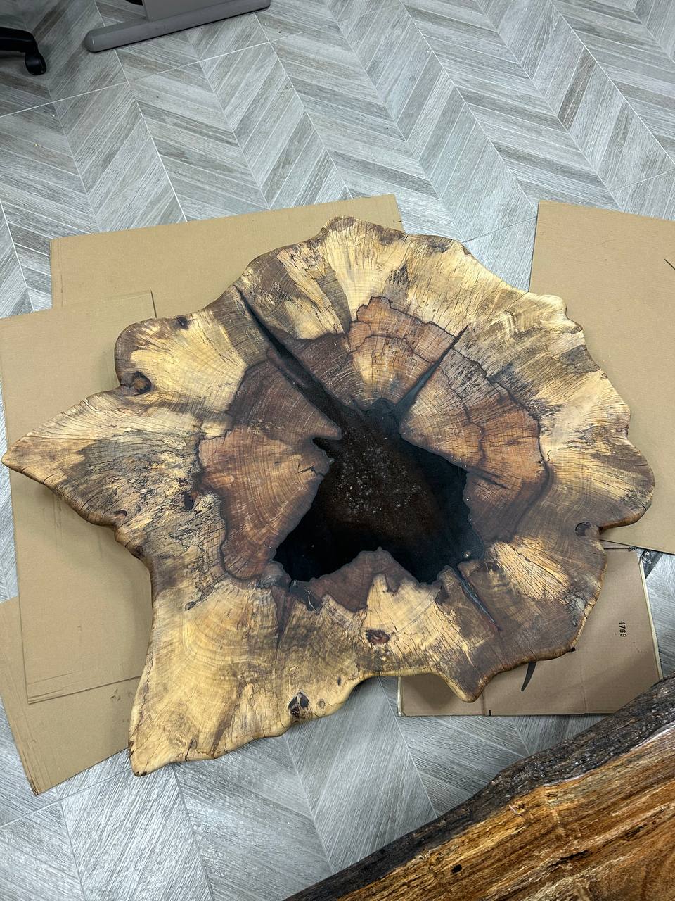 This slab is ideal for a coffee table or statement piece. Large diameter and natural form make it a centerpiece for modern or rustic interiors. Cracks and center void can be filled with epoxy for a premium finish.